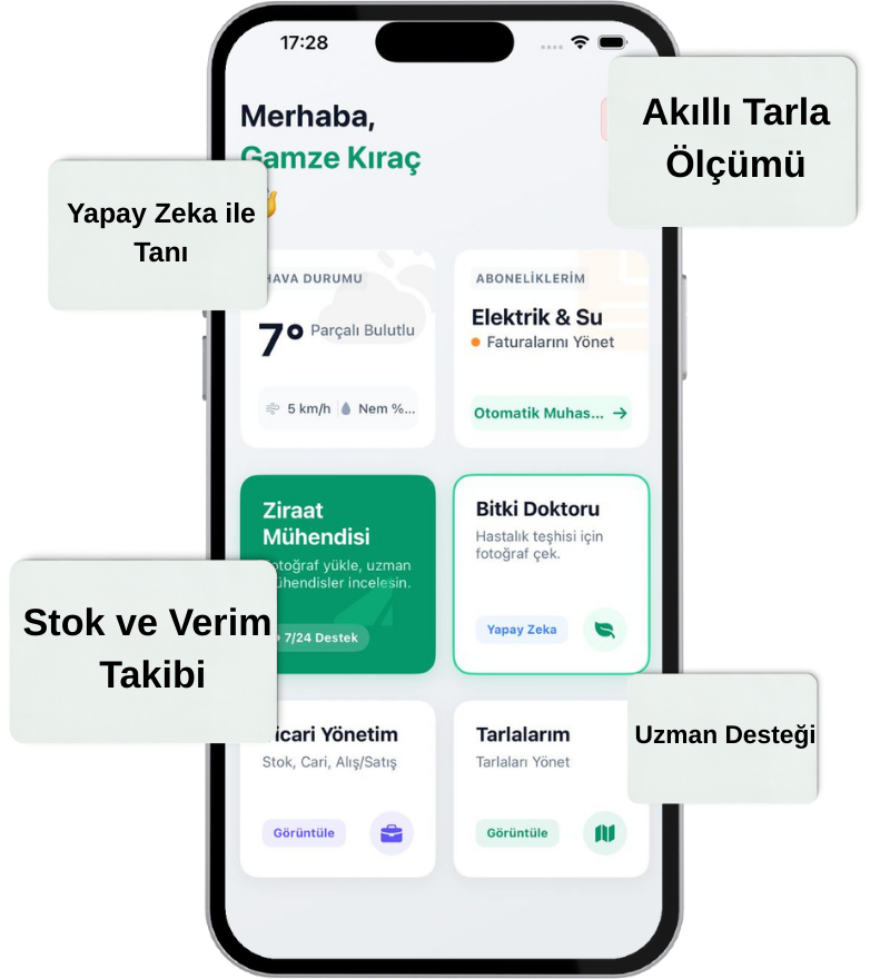 Tarlanızı akıllı verilerle yönetin. Hastalık teşhisinden hava durumuna, stok takibinden mühendis desteğine kadar her şey tek bir uygulamada.